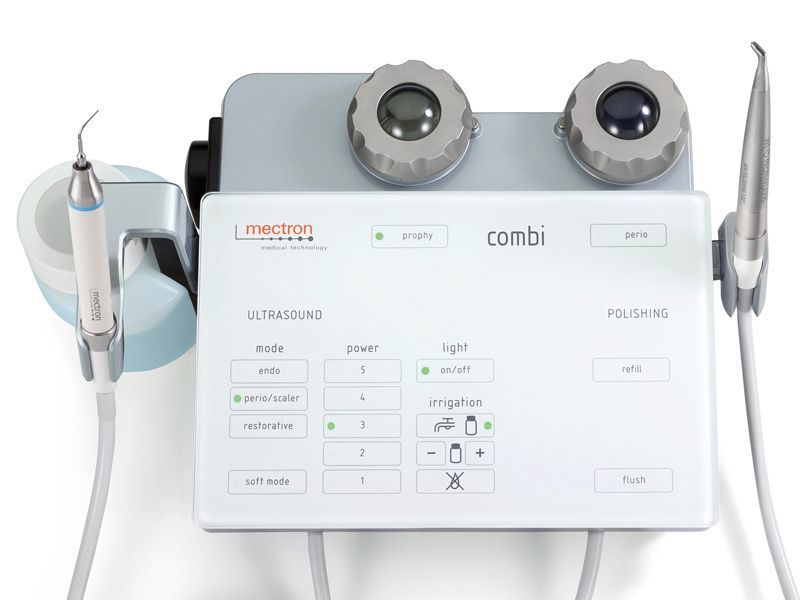 Il combi touch integra un dispositivo ad ultrasuoni e un getto di polveri di glicina o bicarbonato in un'unica unità, consentendo di effettuare una profilassi completa e indolore.